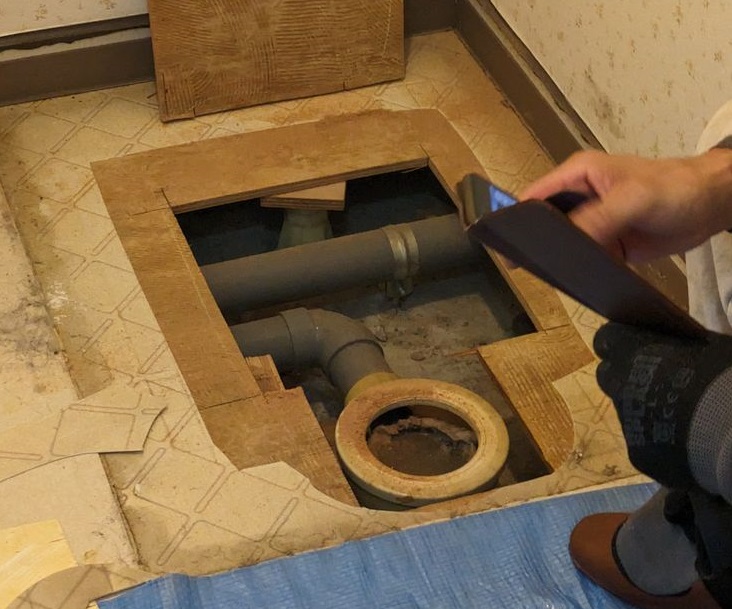 床を慎重にめくりながら探った結果、原因は流し台へと続く配管部分にあることが判明しました。